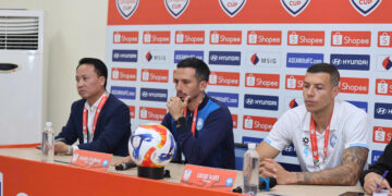 HLV Mano Polking và hậu vệ Đoàn Văn Hậu thể hiện quyết tâm của CAHN tại buổi họp báo trước...