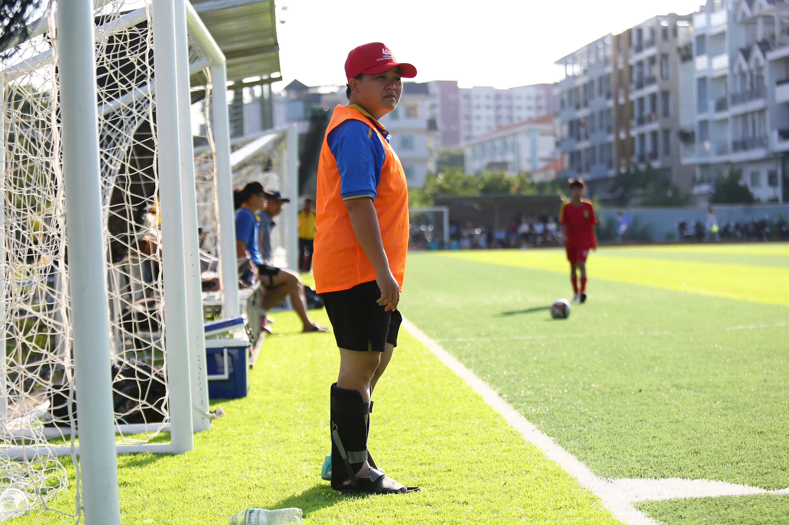 Dù gặp chấn thương ở chân, HLV Bùi Thị Cẩm Nương vẫn trực tiếp chỉ đạo, tiếp thêm tinh thần cho các học trò trong cuộc đối đầu được dự báo nhiều thử thách.