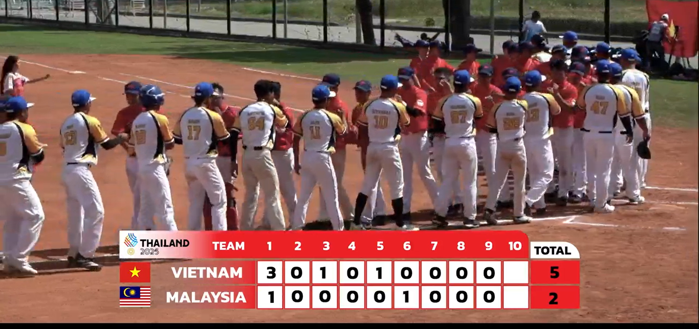 Đội tuyển Bóng chày Việt Nam có chiến thắng đầu tiên tại SEA Games 33 khi đã vượt qua Đội tuyển Bóng chày Malaysia với tỉ số chung cuộc 5-2 sau chín hiệp thi đấu ở lượt trận thứ hai giai đoạn thi đấu vòng tròn.