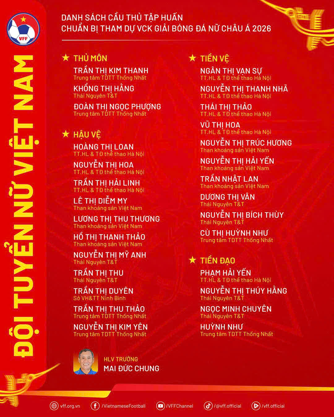 Về nhân sự, ĐT nữ Việt Nam triệu tập 28 cầu thủ, trong đó phần lớn là những gương mặt từng góp mặt tại SEA Games 33, bên cạnh sự bổ sung của một số cầu thủ trẻ tiềm năng.