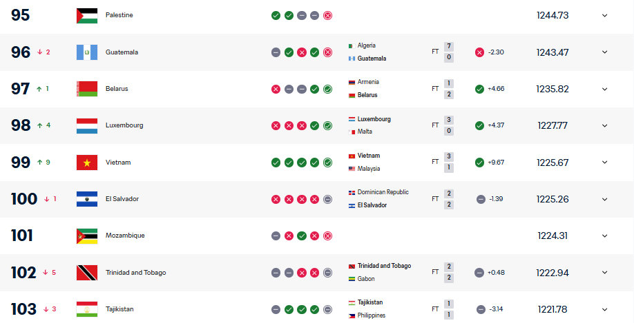 Trong khi đó, các đội xếp gần Việt Nam như El Salvador hay Mozambique không có thêm điểm số đáng kể, tạo điều kiện để ĐT Việt Nam duy trì vị trí trong top 100.