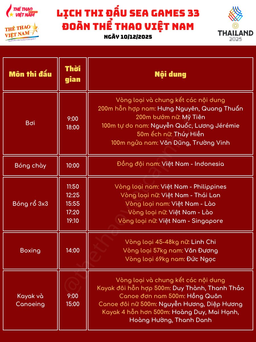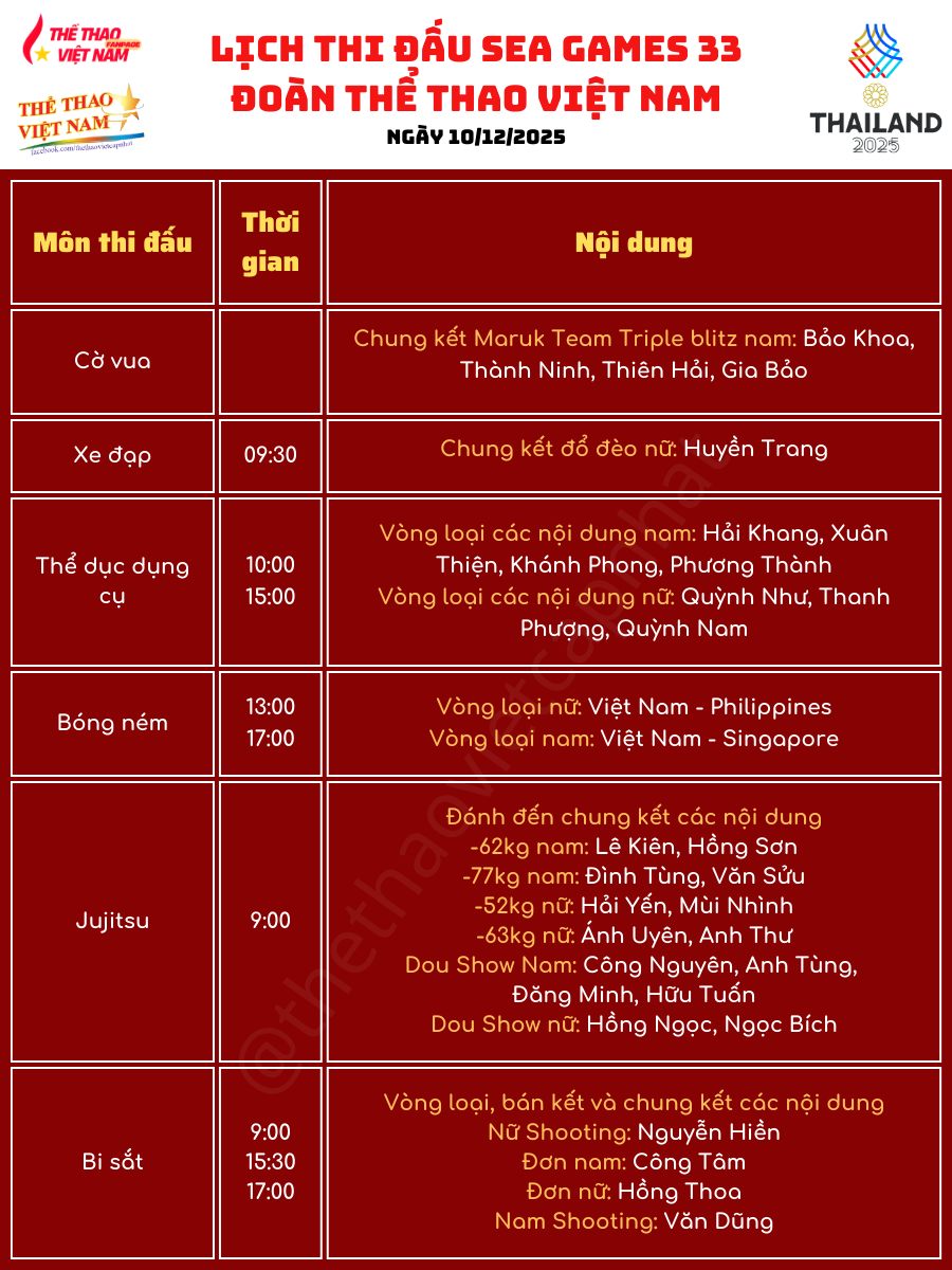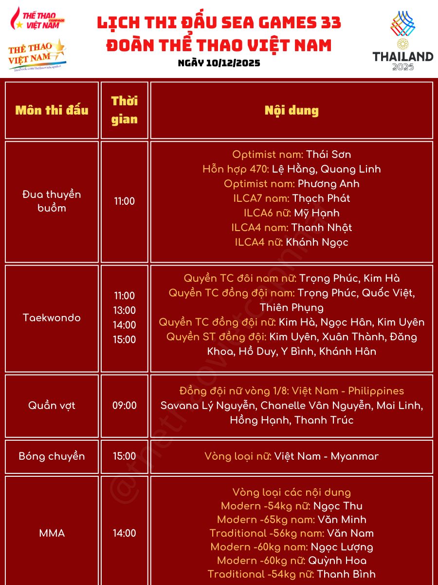 Với lịch thi đấu dày đặc và nhiều gương mặt nổi bật cùng góp mặt, người hâm mộ kỳ vọng ngày 10-12 sẽ là một ngày “bội thu” huy chương, tạo động lực cho Đoàn Thể thao Việt Nam tại SEA Games 33.