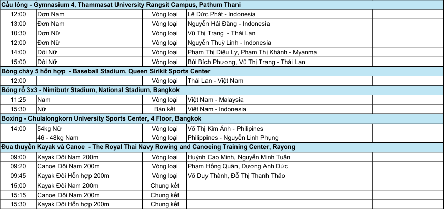 Tại cầu lông, loạt trận vòng loại đơn nam, đơn nữ và đôi nữ diễn ra từ 10h30 đến 15 giờ. Các tay vợt Lê Đức Phát, Nguyễn Hải Đăng, Vũ Thị Trang, Nguyễn Thùy Linh, cùng các đôi nữ Phạm Thị Diệu Ly – Phạm Thị Khánh và Bùi Bích Phương – Vũ Thị Trang sẽ ra quân trong ngày.