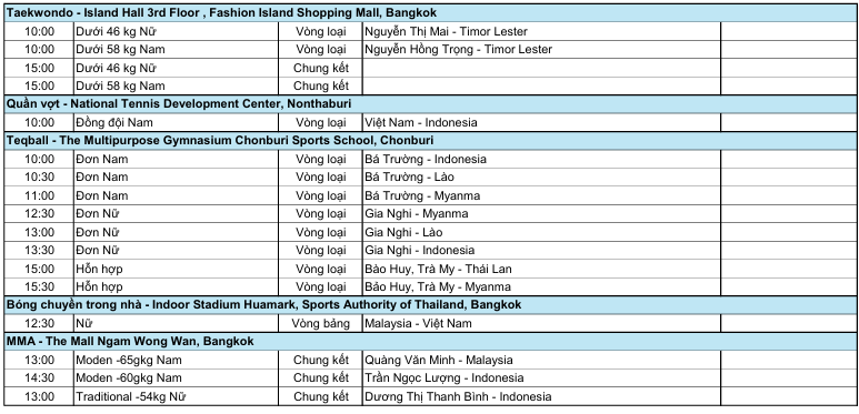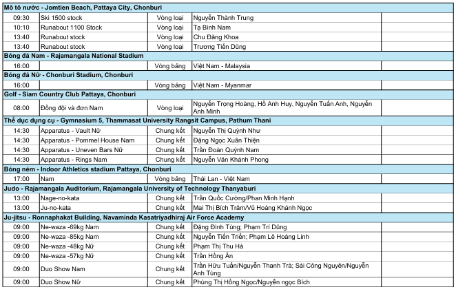 Đáng chú ý, ở môn bóng đá, cả hai ĐT nam và nữ của Việt Nam đều bước vào các trận đấu có ý nghĩa quyết định tấm vé vào vòng bán kết. Ở nội dung bóng đá nam, U22 Việt Nam sẽ đối đầu U22 Malaysia. Trong khi đó, tuyển nữ Việt Nam chạm trán Myanmar ở trận đấu then chốt không kém phần quan trọng. Cả hai trận đấu sẽ diễn ra cùng thời điểm, vào lúc 16h.