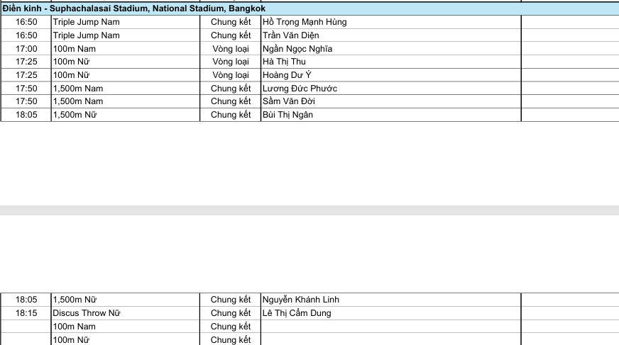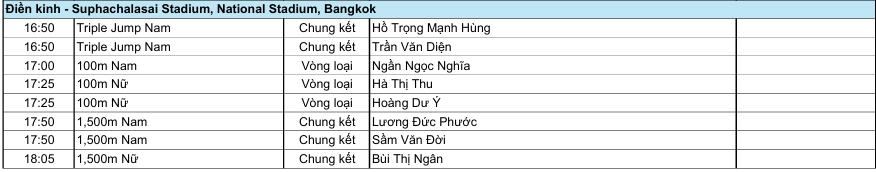 Ở điền kinh, Việt Nam tham dự nhiều nội dung quan trọng như nhảy xa ba bước nam với Hồ Trọng Mạnh Hùng và Trần Văn Diện (16h50), 100m nam – nữ vòng loại, các cự ly 1.500m của Lương Đức Phước, Sầm Văn Đời, Bùi Thị Ngân và Nguyễn Khánh Linh, cùng nội dung ném đĩa của Lê Thị Cẩm Dung.