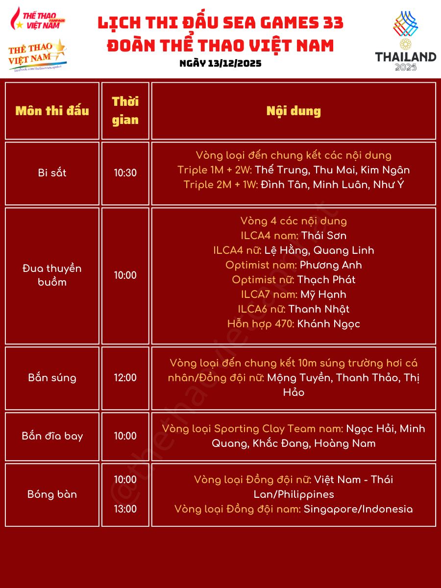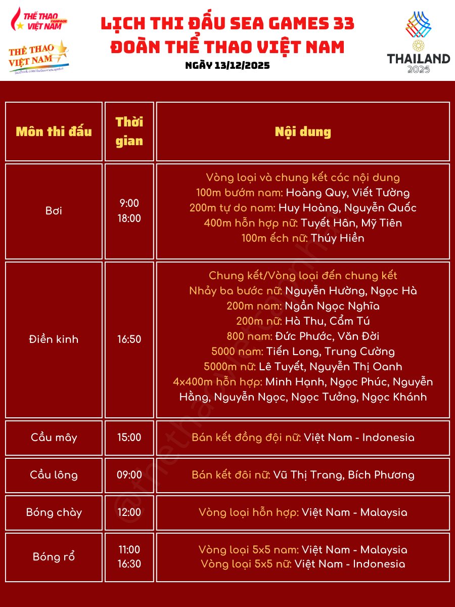 Hôm nay tiếp tục là một trong những ngày thi đấu quan trọng của Đoàn TTVN tại SEA Games 33 khi nhiều nội dung bước vào vòng bán kết và chung kết, đặc biệt ở hai môn trọng điểm là bơi và điền kinh.