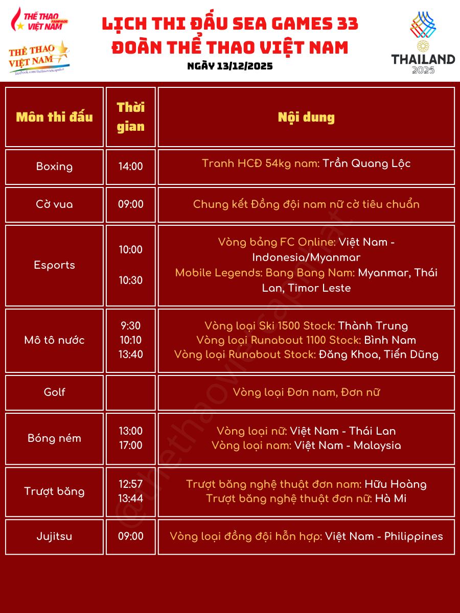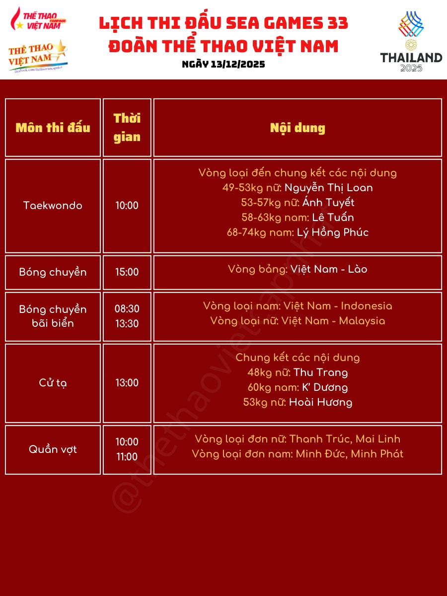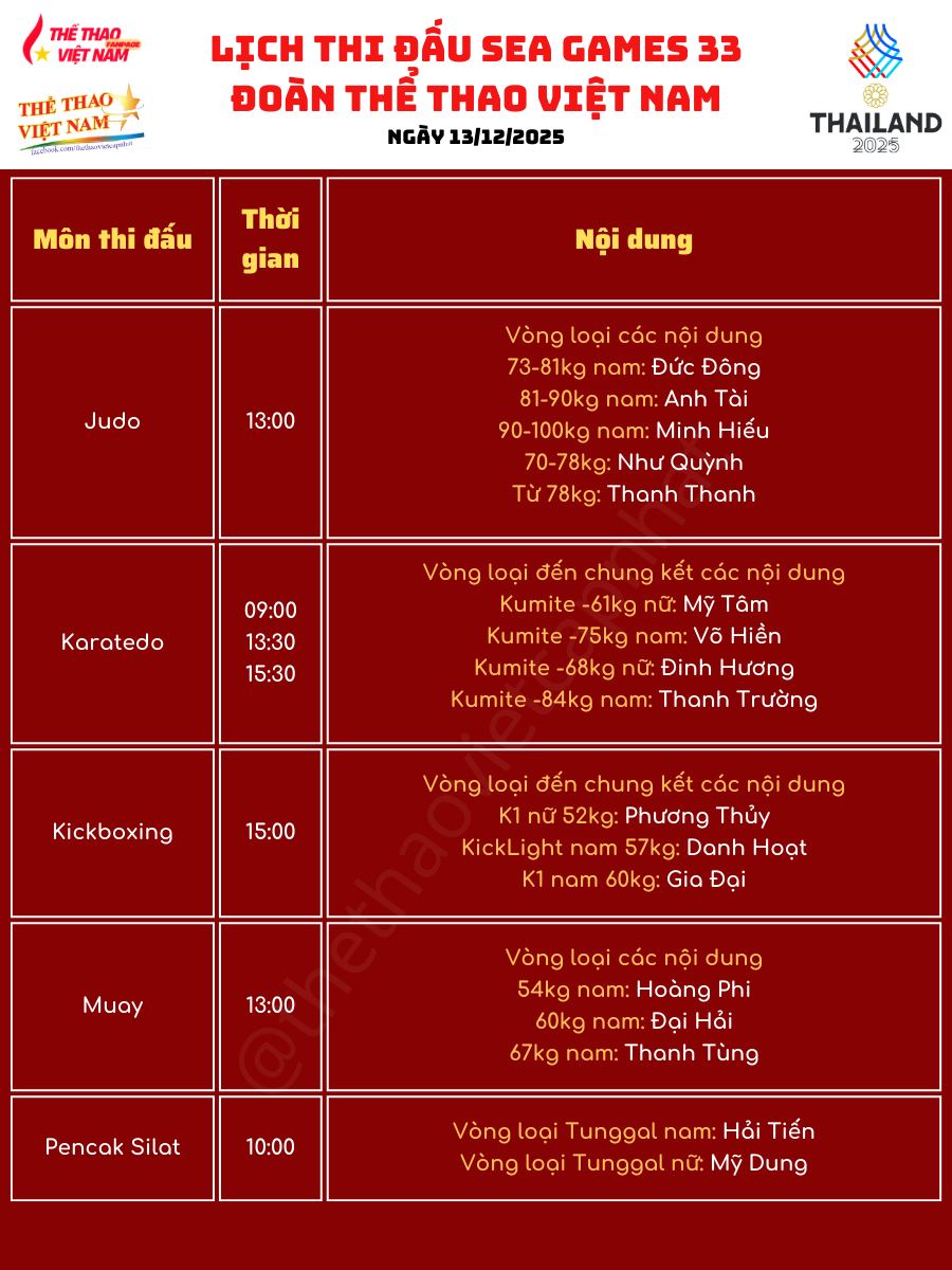 Với mật độ thi đấu lớn và nhiều nội dung trọng điểm, ngày 13-12 được kỳ vọng sẽ mang về thêm huy chương cho Đoàn TTVN.