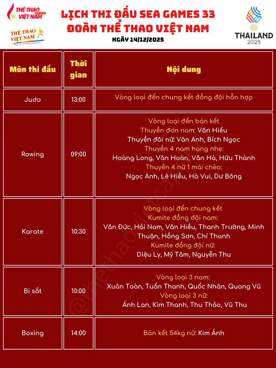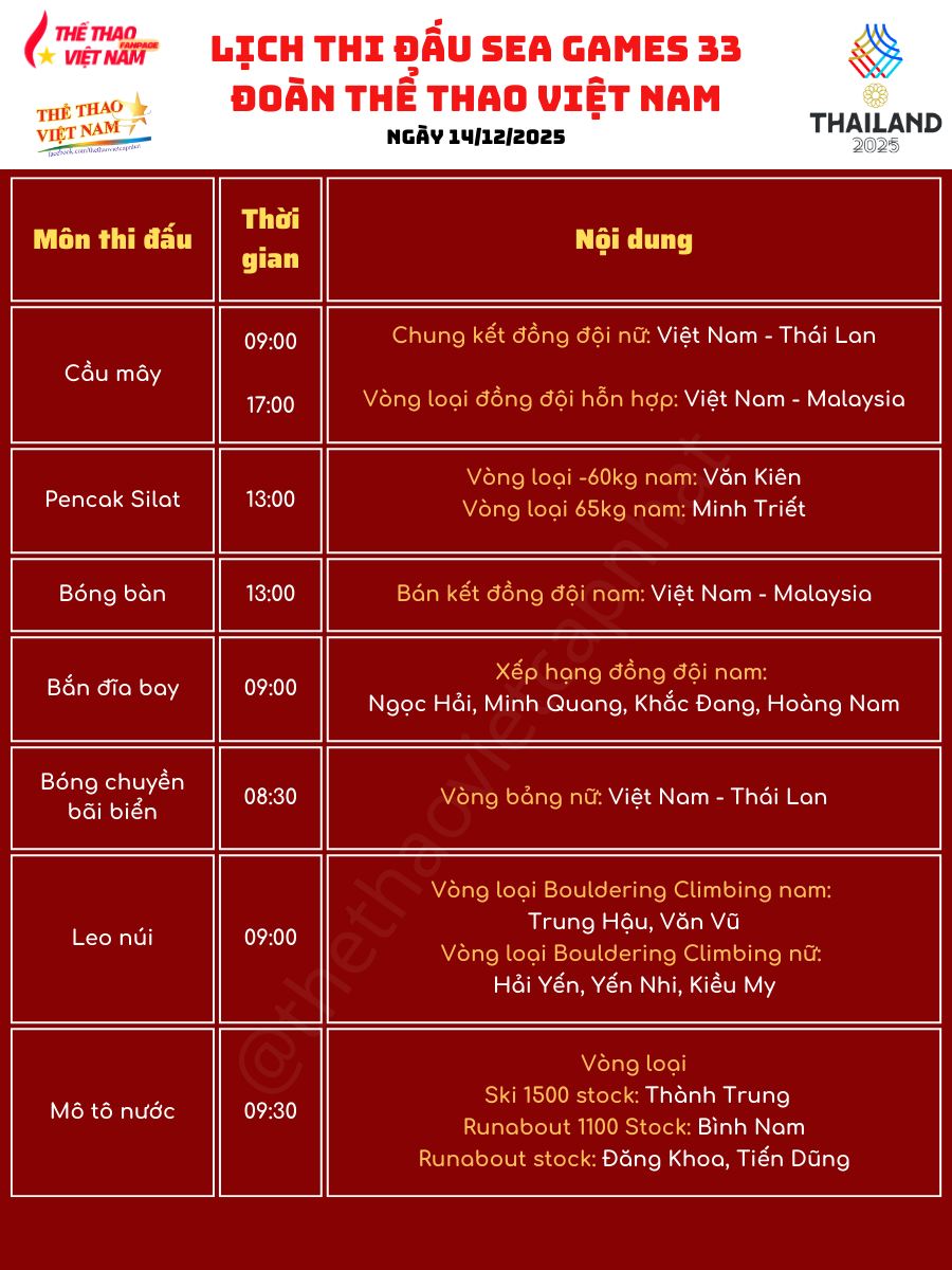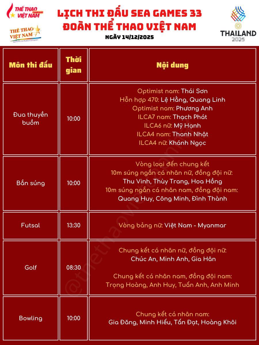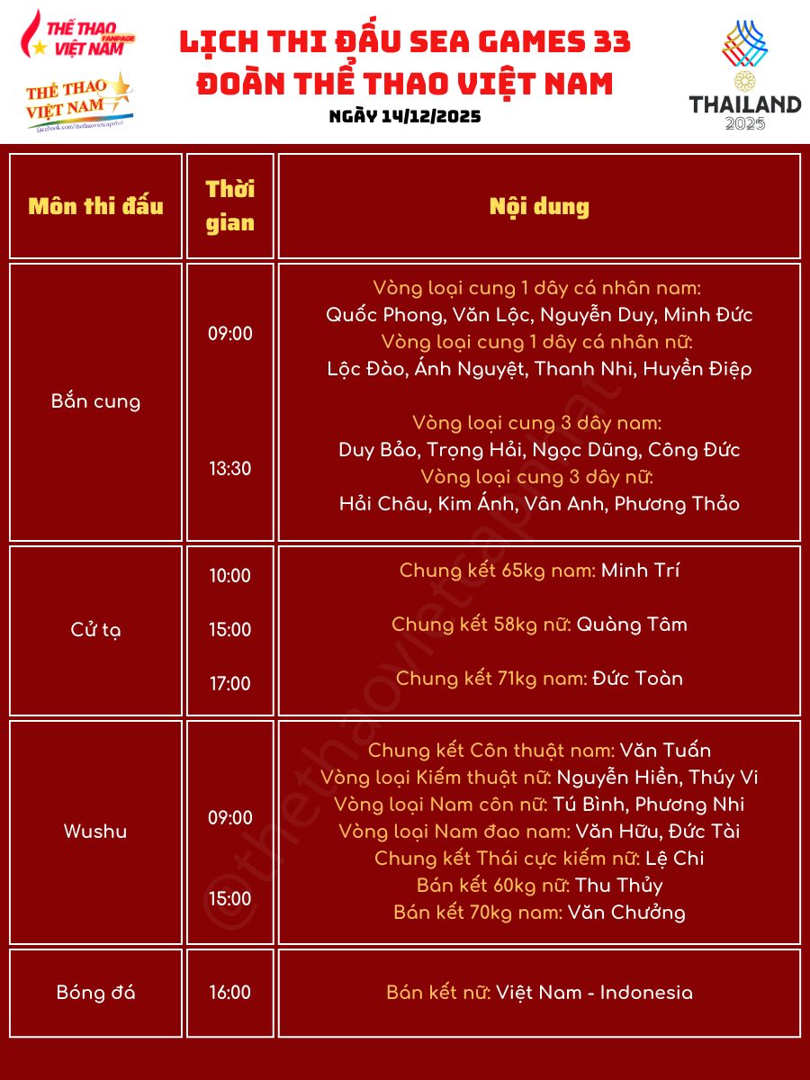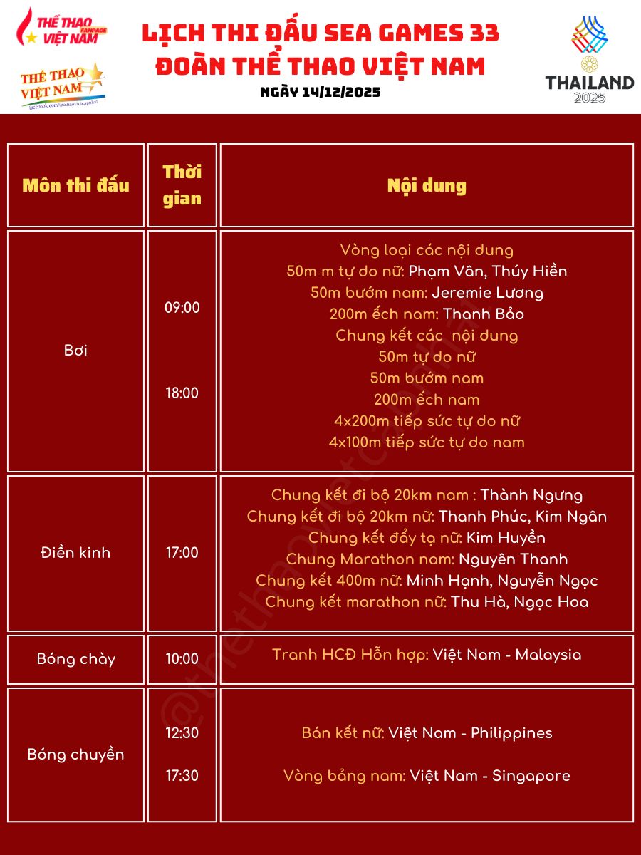 Ngày 14-12 hứa hẹn là một trong những ngày thi đấu sôi động nhất của Đoàn TTVN Việt Nam tại SEA Games 33 khi các vận động viên sẽ tranh tài tại ít nhất 11 nội dung chung kết, tập trung chủ yếu vào buổi chiều và tối. Bơi lội, điền kinh, xe đạp, golf, cử tạ cùng một loạt môn võ thuật được kỳ vọng sẽ mang về thêm những tấm huy chương quan trọng cho đoàn.