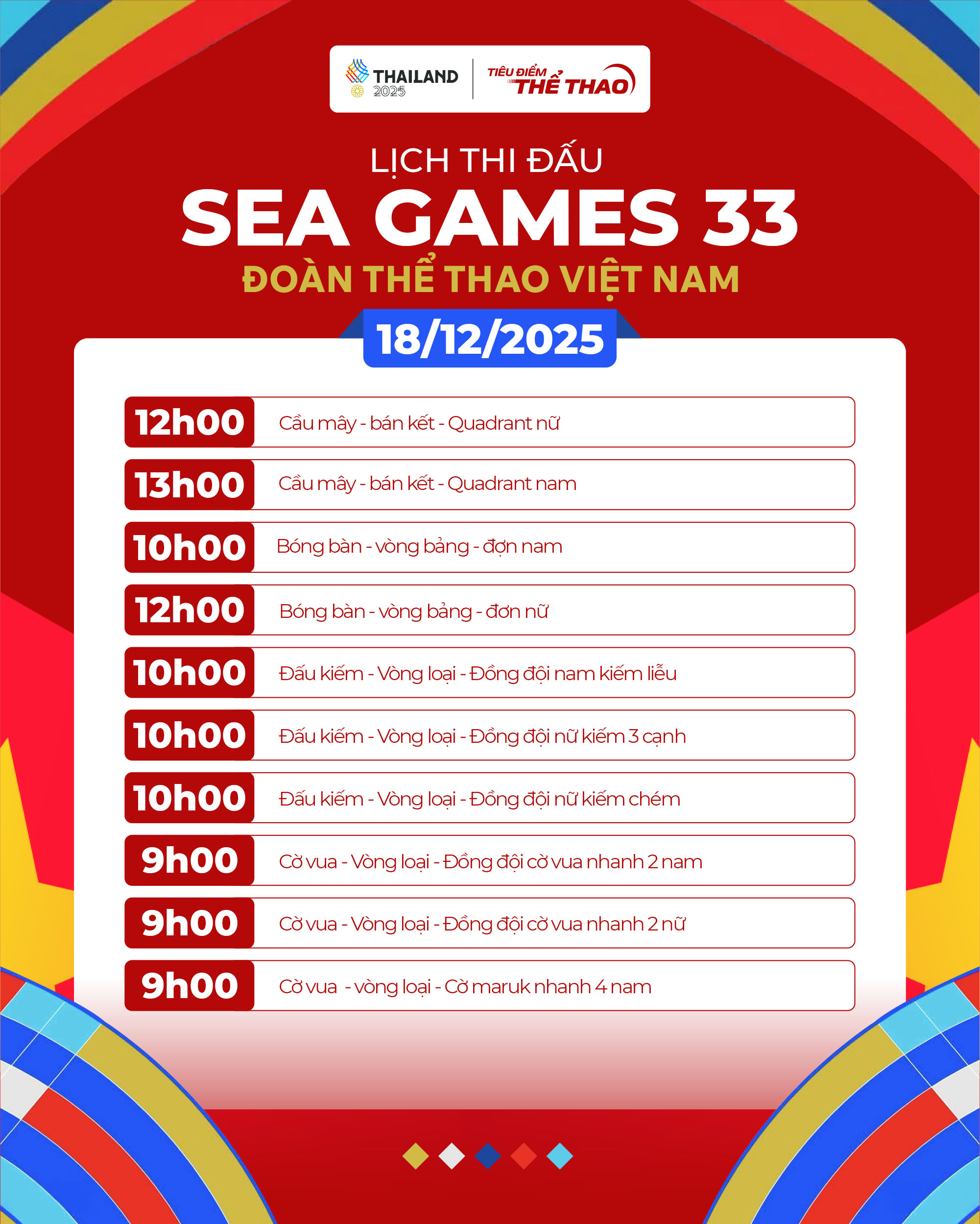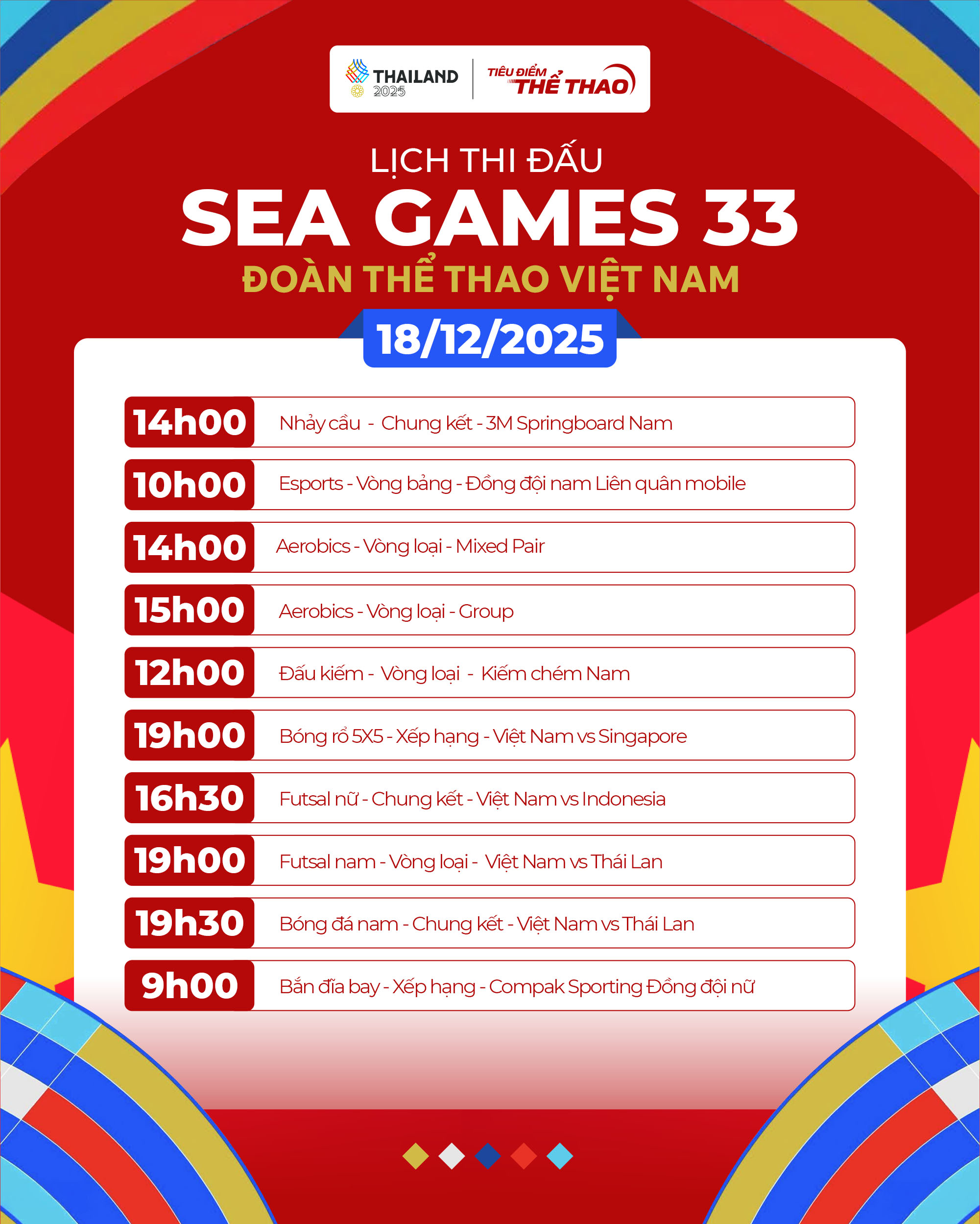 Ngày thi đấu 18-12 của SEA Games 33 được dự báo sẽ là một trong những ngày sôi động và giàu cảm xúc nhất của Đoàn TTVN khi các VĐV bước vào hàng loạt nội dung chung kết, tranh HCV ở nhiều môn thế mạnh. Đặc biệt, tâm điểm của ngày thi đấu là cuộc đối đầu đầy duyên nợ trong trận chung kết bóng đá nam giữa U22 Việt Nam và U22 Thái Lan trên sân Rajamangala.