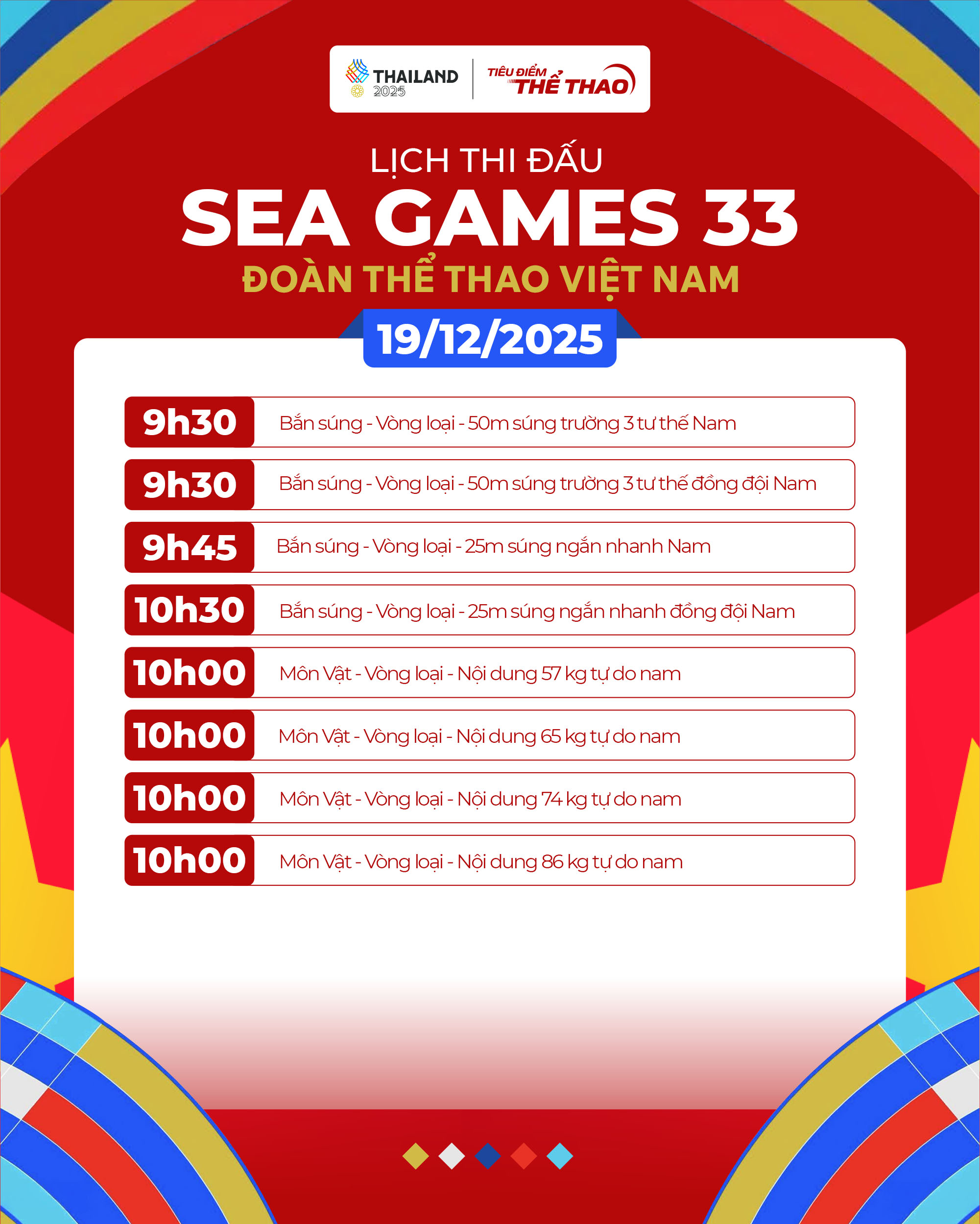 Lịch thi đấu ngày áp chót SEA Games 33 (19-12) hứa hẹn tiếp tục là một ngày tranh tài sôi động với sự góp mặt của nhiều VĐV Việt Nam trong các trận chung kết tranh huy chương.