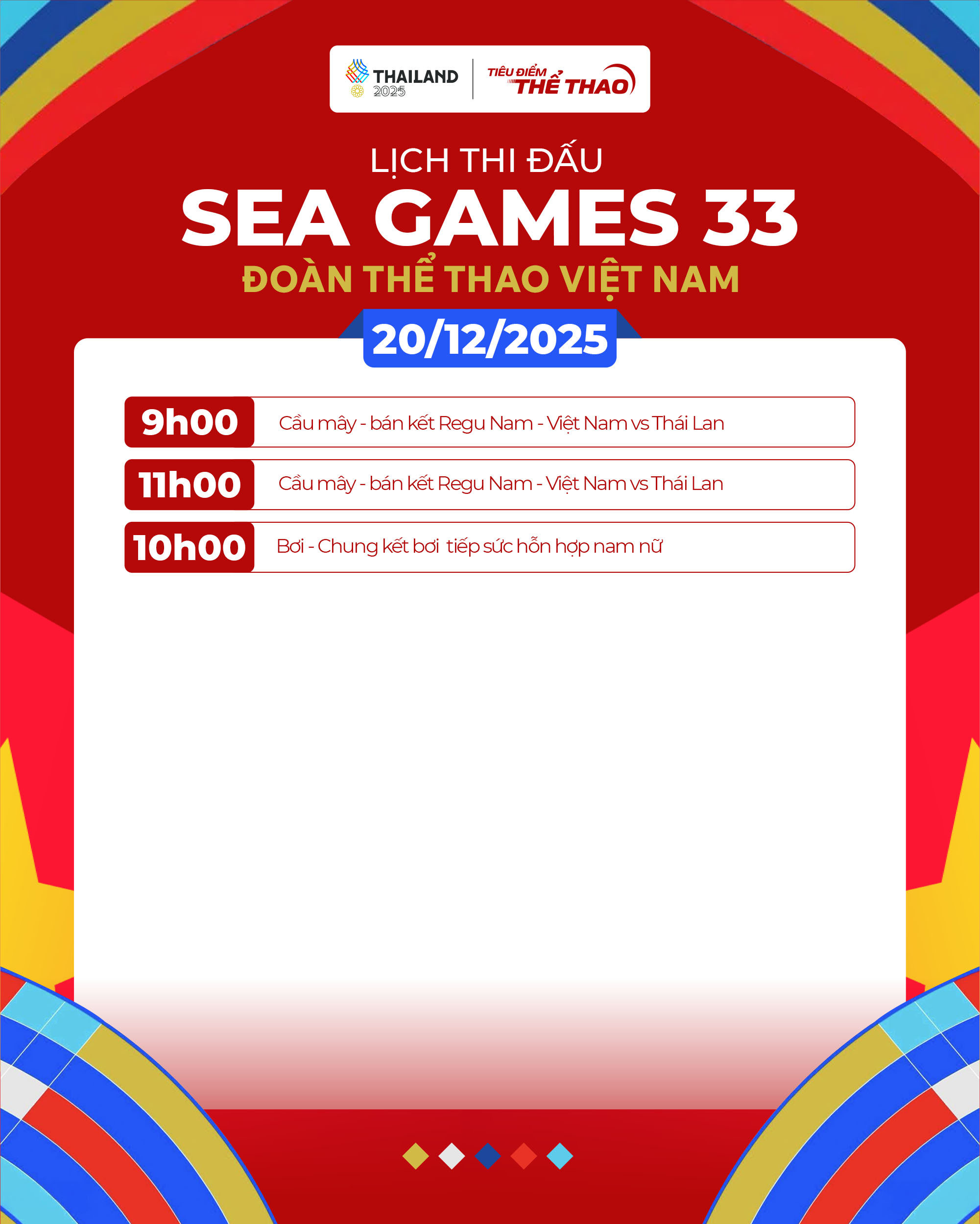 Ngày 20-12 là ngày thi đấu cuối cùng của Đoàn TTVN tại SEA Games 33 trước khi Đại hội khép lại. Trong ngày này, các VĐV Việt Nam tranh tài ở hai môn bơi ngoài trời và cầu mây, với tâm điểm là những cuộc đối đầu trực tiếp với chủ nhà Thái Lan.