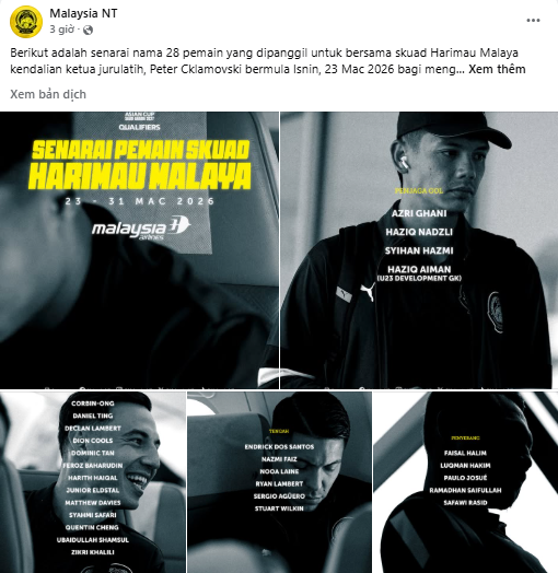 Chiều 19-3, Liên đoàn Bóng đá Malaysia (FAM) đã chính thức công bố danh sách sơ bộ 28 cầu thủ chuẩn bị cho trận đấu gặp ĐT Việt Nam tại vòng loại Asian Cup 2027.