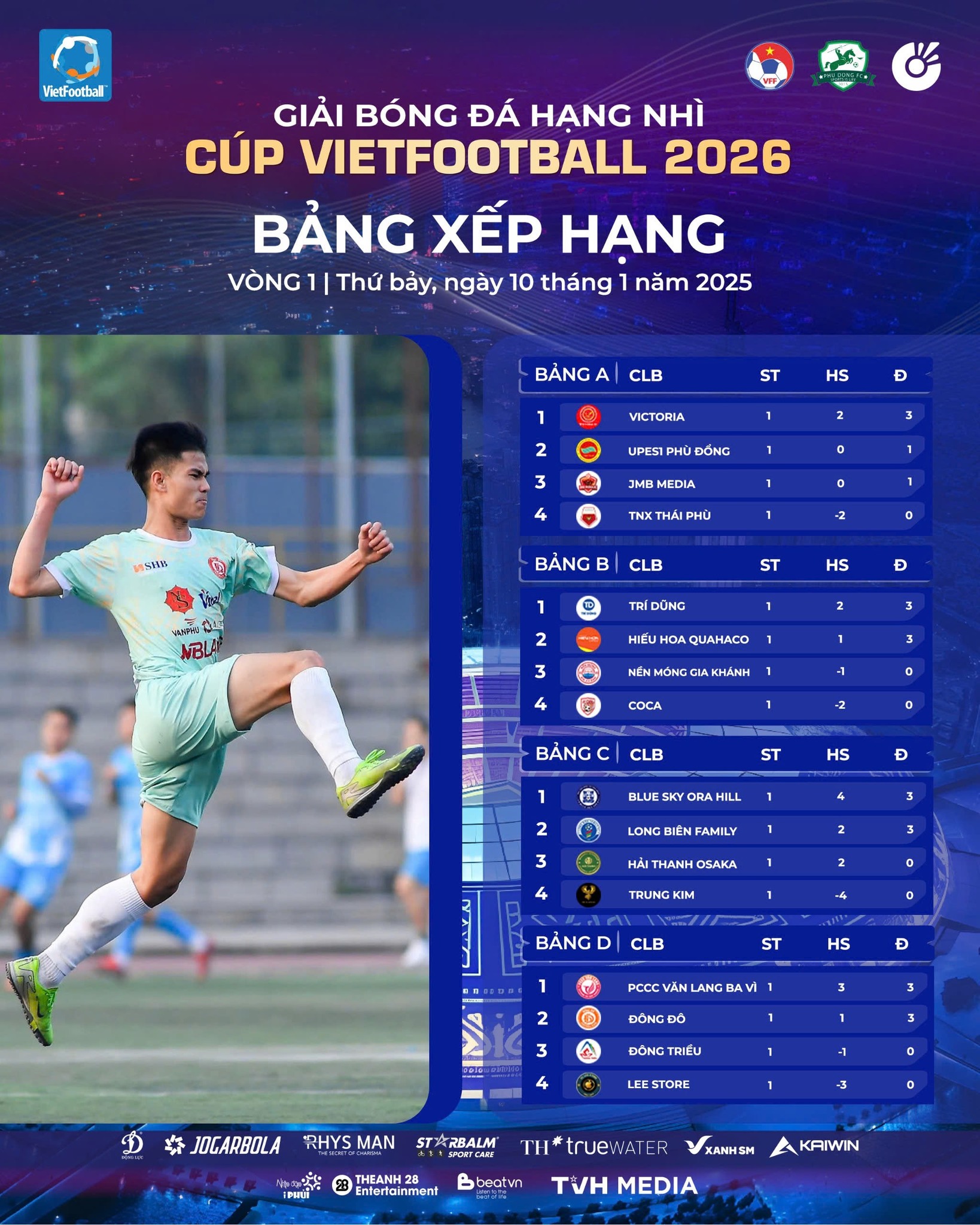 Ở lượt đấu cuối, Victoria vượt qua TNX Thái Phù với kết quả 2-0. Ở sân bên cạnh, JMB Media cùng Upes1 Phù Đổng chơi ngang tài ngang sức. Hai đội chia điểm trong trận cầu không bàn thắng ở vòng 1 Giải bóng đá hạng Nhì – Cúp VietFootball 2026 (HL2-S8).