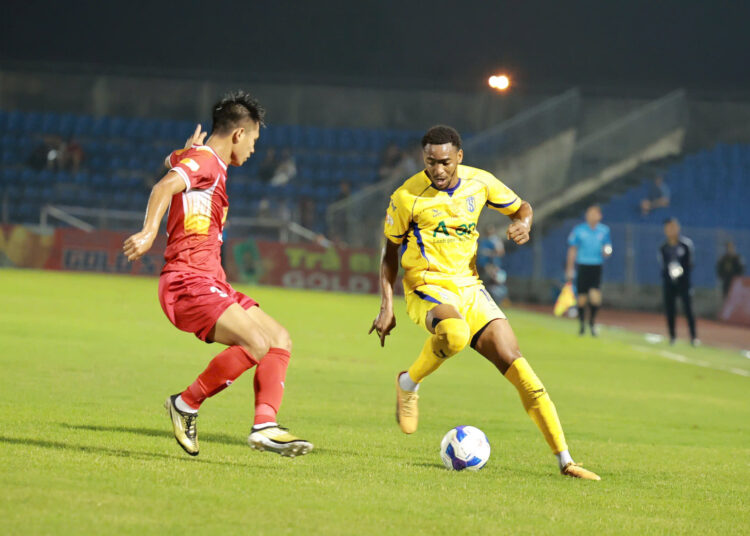 Từ một pha đi bóng lắt léo vượt qua hàng phòng ngự HLHT, tiền đạo Olaha bất ngờ tung cú sút xa đầy quyết đoán từ ngoài vòng cấm. Bóng đi hiểm hóc đánh bại thủ thành Thanh Tùng bên phía đội chủ nhà, mở tỷ số 1-0 cho các cầu thủ SLNA.