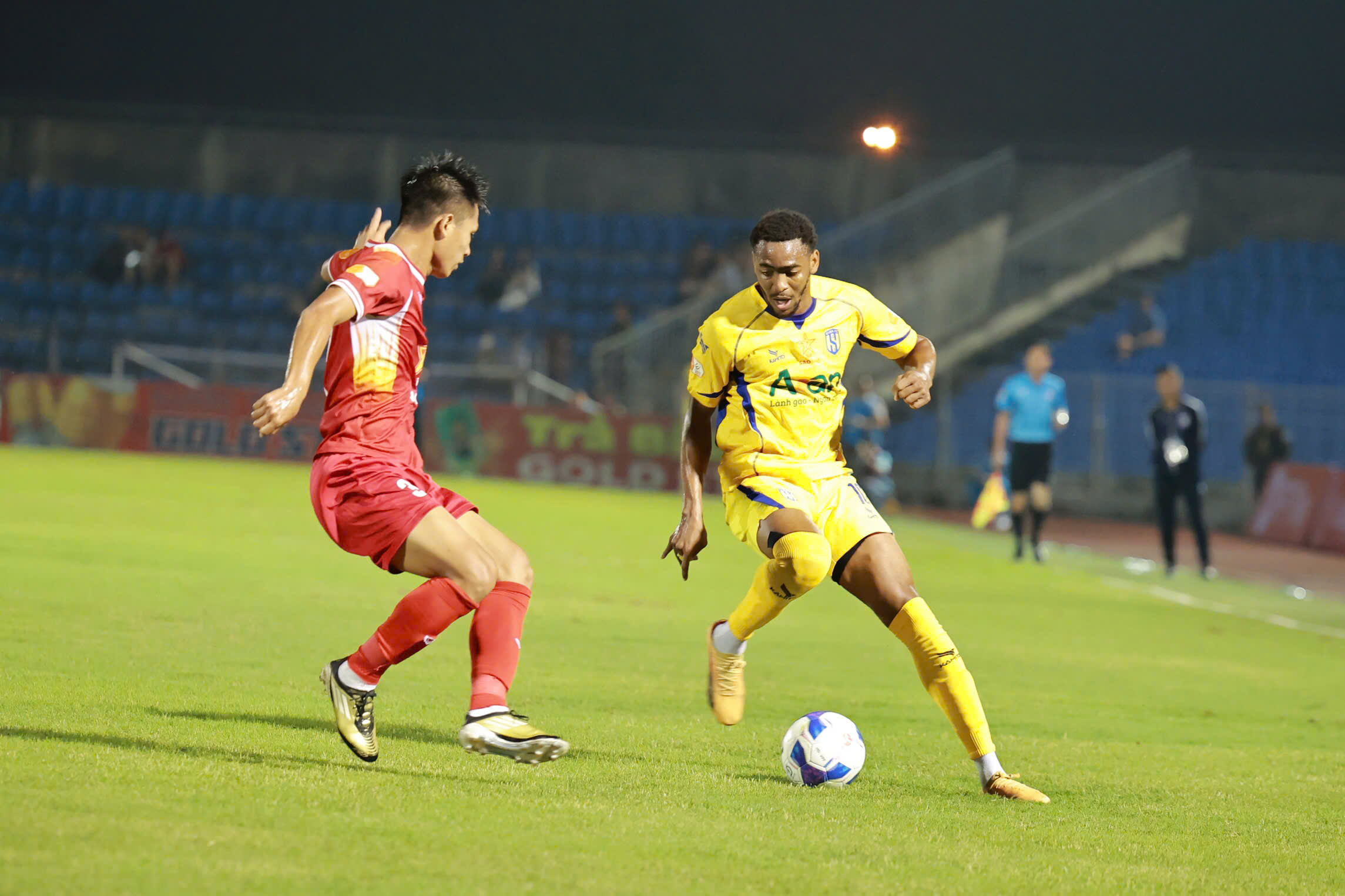 Từ một pha đi bóng lắt léo vượt qua hàng phòng ngự HLHT, tiền đạo Olaha bất ngờ tung cú sút xa đầy quyết đoán từ ngoài vòng cấm. Bóng đi hiểm hóc đánh bại thủ thành Thanh Tùng bên phía đội chủ nhà, mở tỷ số 1-0 cho các cầu thủ SLNA.