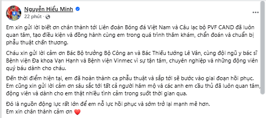 Trong bài đăng, Hiểu Minh gửi lời tri ân tới Liên đoàn Bóng đá Việt Nam (VFF) và CLB PVF-CAND vì đã dành sự quan tâm sát sao, hỗ trợ và tạo điều kiện trong suốt quá trình thăm khám, chẩn đoán cũng như chuẩn bị cho ca mổ.