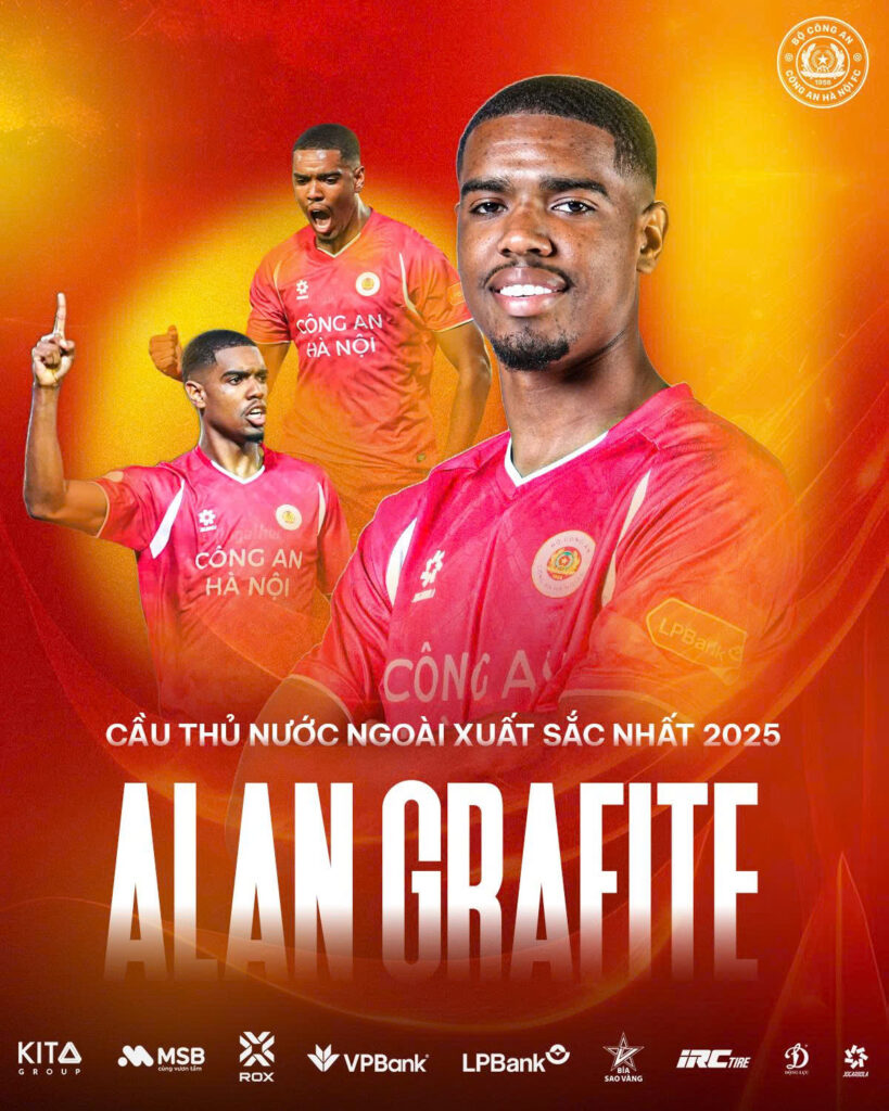 Chân sút ngoại Alan của CLB CAHN đã được vinh danh ở hạng mục cầu thủ nước ngoài xuất sắc nhất trong năm 2025. Điểm sáng lớn nhất của Alan chính là việc cùng với CAHN đi đến trận chung kết Cúp các CLB Đông Nam Á 2025.