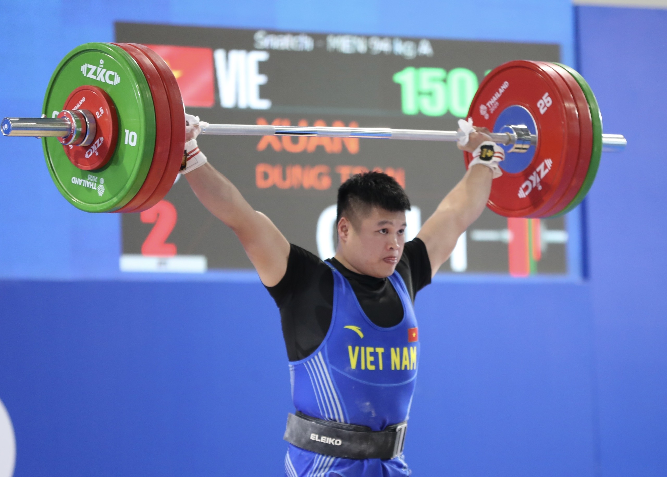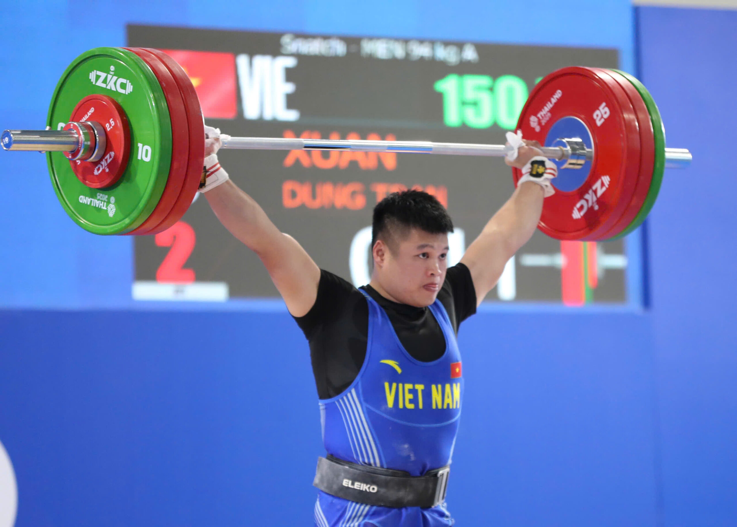 Đô cử Trần Xuân Dũng đang tranh HCV ở hạng cân 94kg nam. Anh kết thúc phần cử giật và nâng được 150kg.
