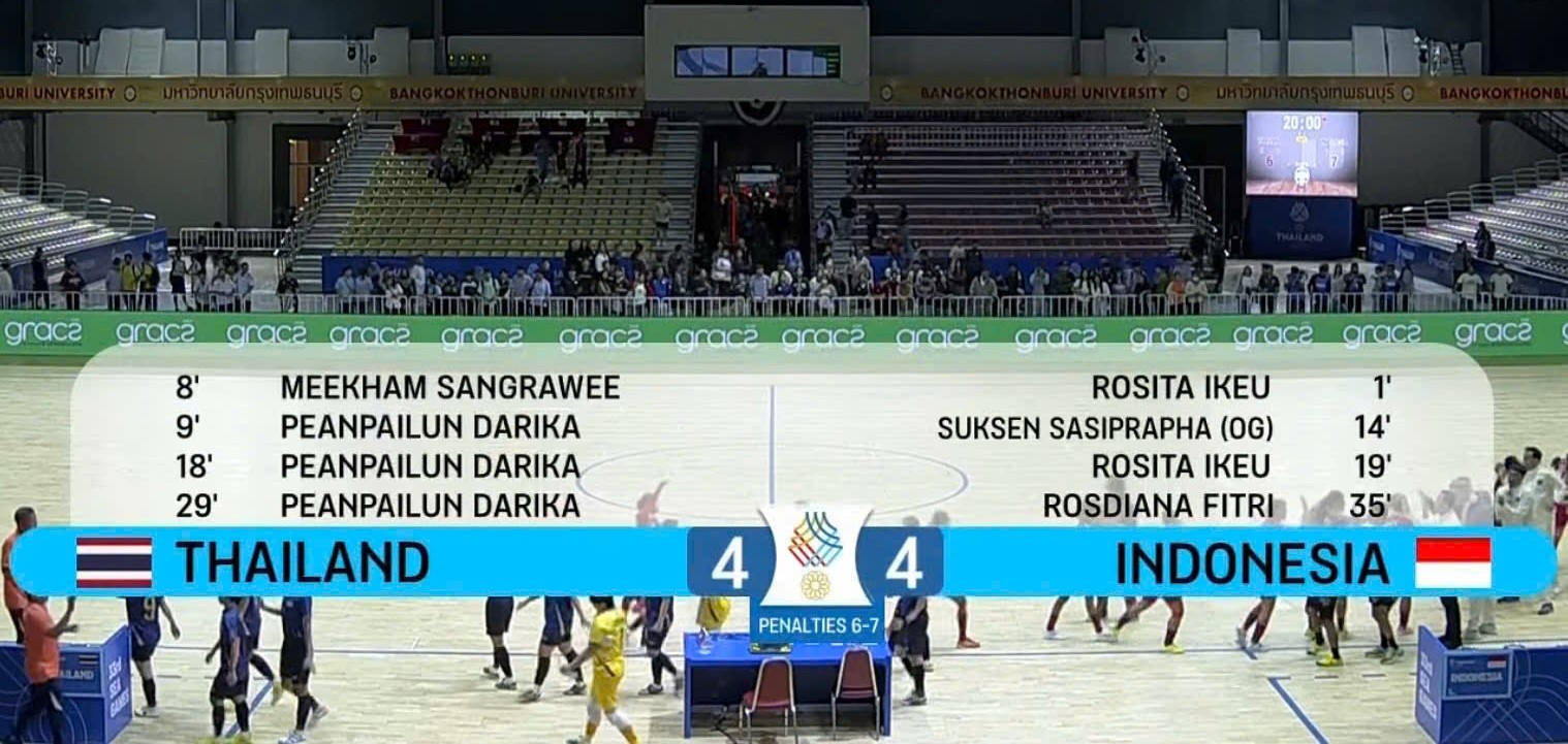 Indonesia thắng loạt penalty cân não với tỉ số 7-6 (4-4 hai hiệp thi đấu chính thức) trước chủ nhà Thái Lan. Indonesia sẽ là đối thủ trong trận chung kết futsal nữ SEA Games 33 sắp tới của futsal nữ Việt Nam. Trước đó, ĐT Futsal nữ Việt Nam đã đánh bại ĐT Futsal nữ Philippines với tỉ số 1-0 do công của Trần Nguyệt Vi.