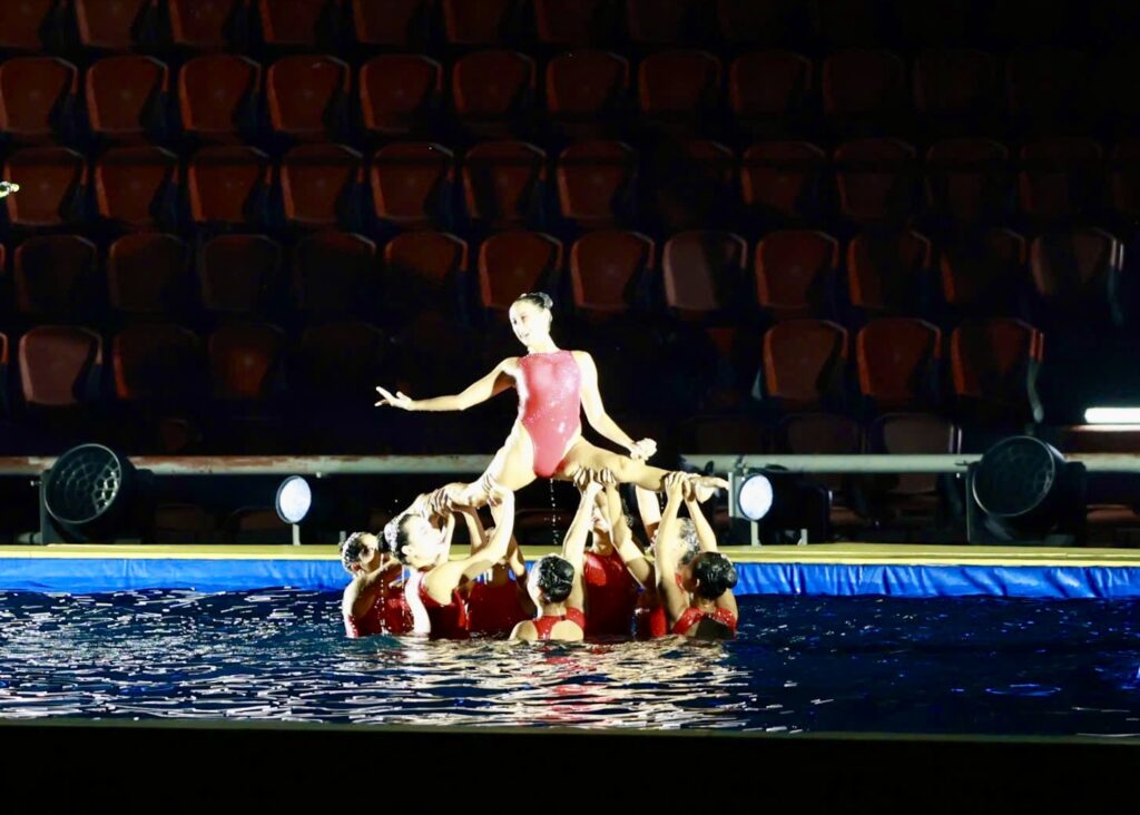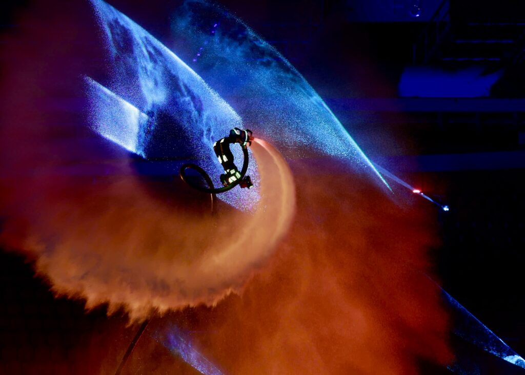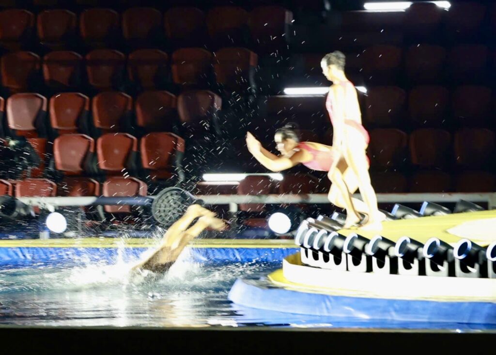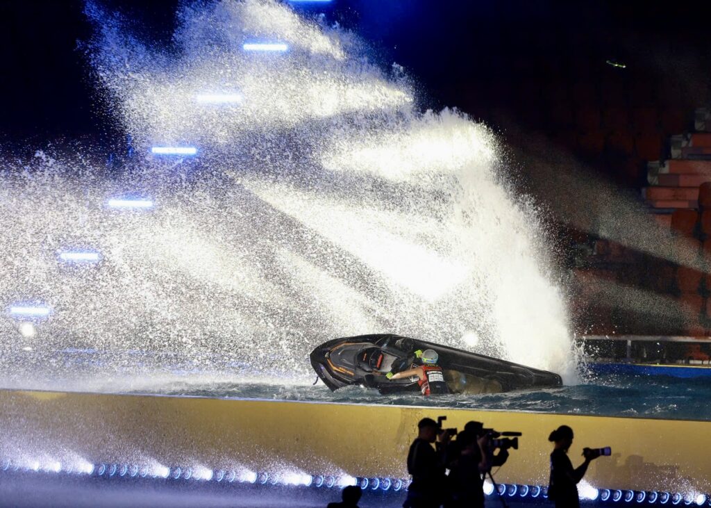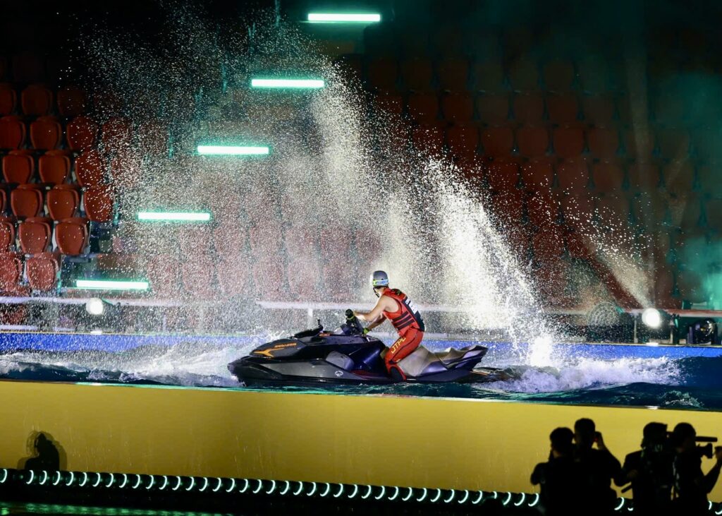 Sau tiết mục này, hai nghệ sĩ biểu diễn mô tô nước, xoay tròn để sóng bắn lên. Sau đó, hai nghệ sĩ khác thực hiện màn nhào lộn trên không, ở độ cao vài met, có thiết bị hỗ trợ.