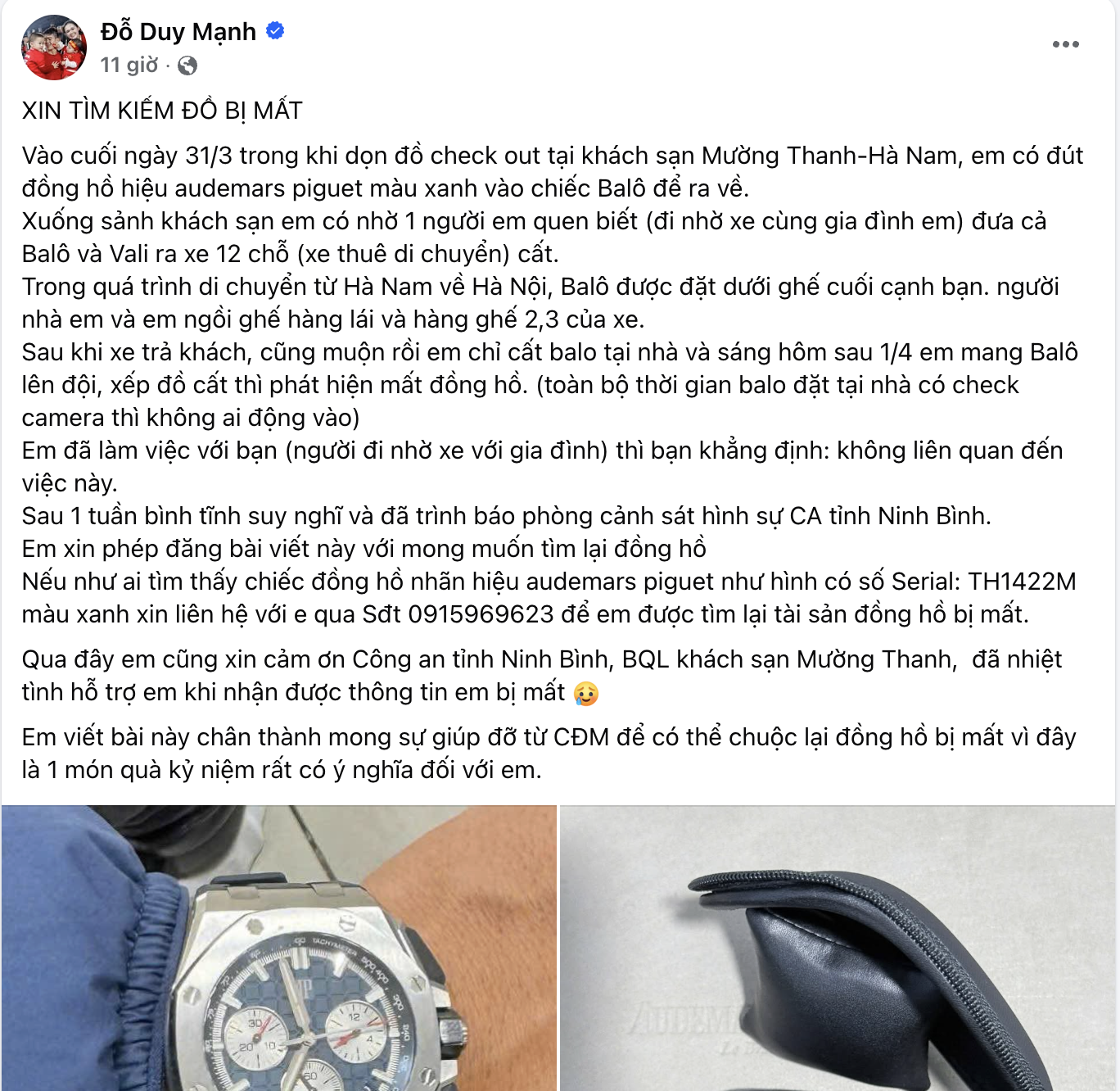 Theo chia sẻ từ Duy Mạnh, chiếc đồng hồ bị mất là sản phẩm của thương hiệu xa xỉ Audemars Piguet, có giá trị ước tính hơn 1 tỷ đồng. Không chỉ đắt giá về mặt vật chất, đây còn là món quà mang ý nghĩa đặc biệt do vợ anh – Nguyễn Quỳnh Anh – tặng cách đây khoảng hai năm, khiến cầu thủ sinh năm 1996 càng thêm mong muốn tìm lại.